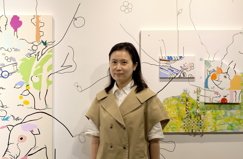 주요 대상을 둘러싼 배경은 여백과 색면으로 정제되어 단순한 평면처럼 보이지만, 그 안에는 관찰의 시간과 경험이 층위로 쌓여 있다. 작가는 화면을 분할해 시점 사이의 연결을 느슨하게 하며, 여백을 통해 관람자가 사라진 형상과 포착되지 않은 순간을 스스로 떠올리도록 한다. 정형 캔버스와 변형 캔버스는 이러한 조형적 탐구를 확장시키며 작품 전체의 리듬과 구조를 형성하는 중요한 장치가 된다.